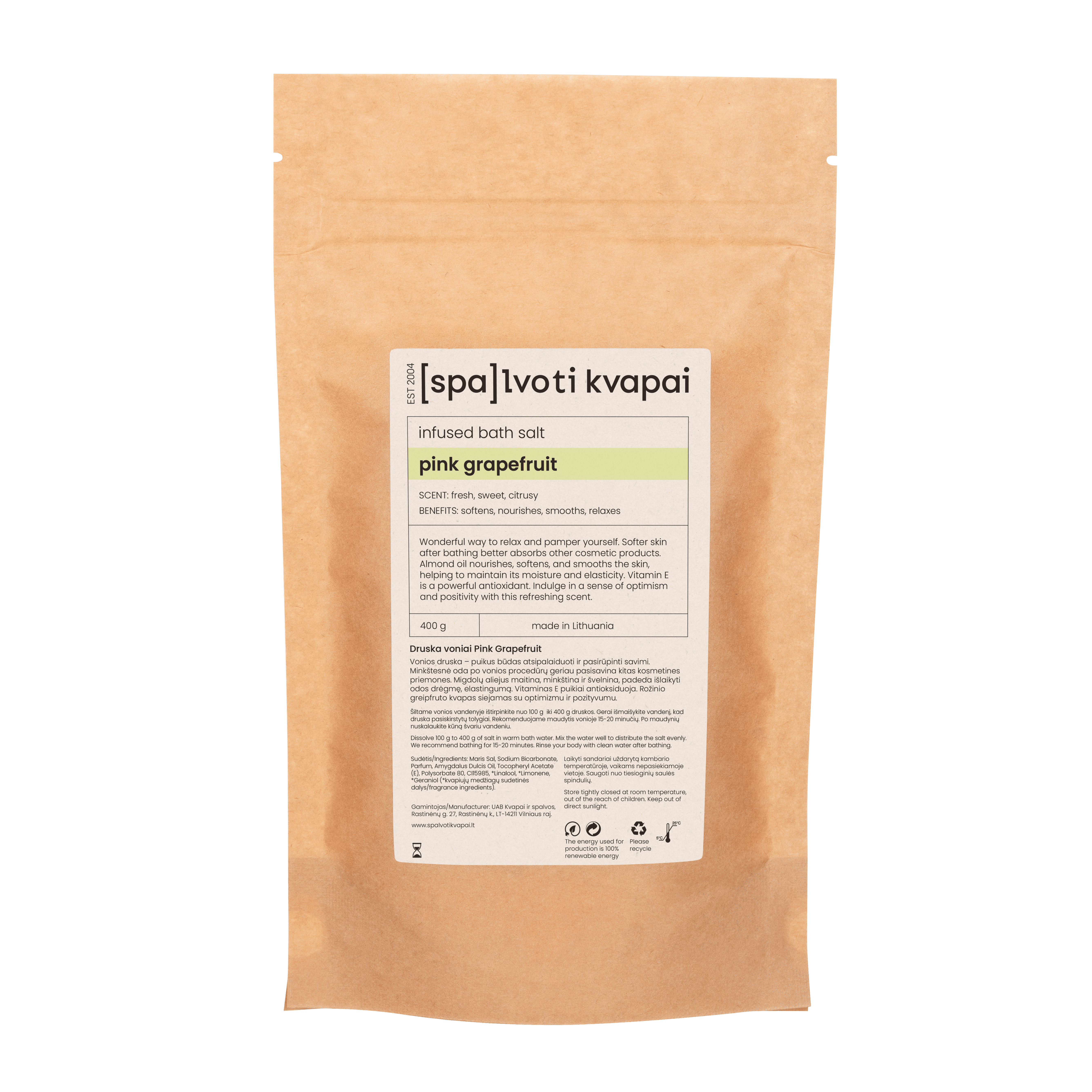 Vonios druska – puikus būdas atsipalaiduoti ir pasirūpinti savimi. Pasirinkę tinkamą druskos rūšį, galite pagerinti savo fizinę ir psichologinę sveikatą. Minkštesnė oda po vonios procedūrų geriau pasisavina kitas kosmetines priemones. Rožinio greipfruto kvapas siejamas su optimizmu ir pozityvumu.