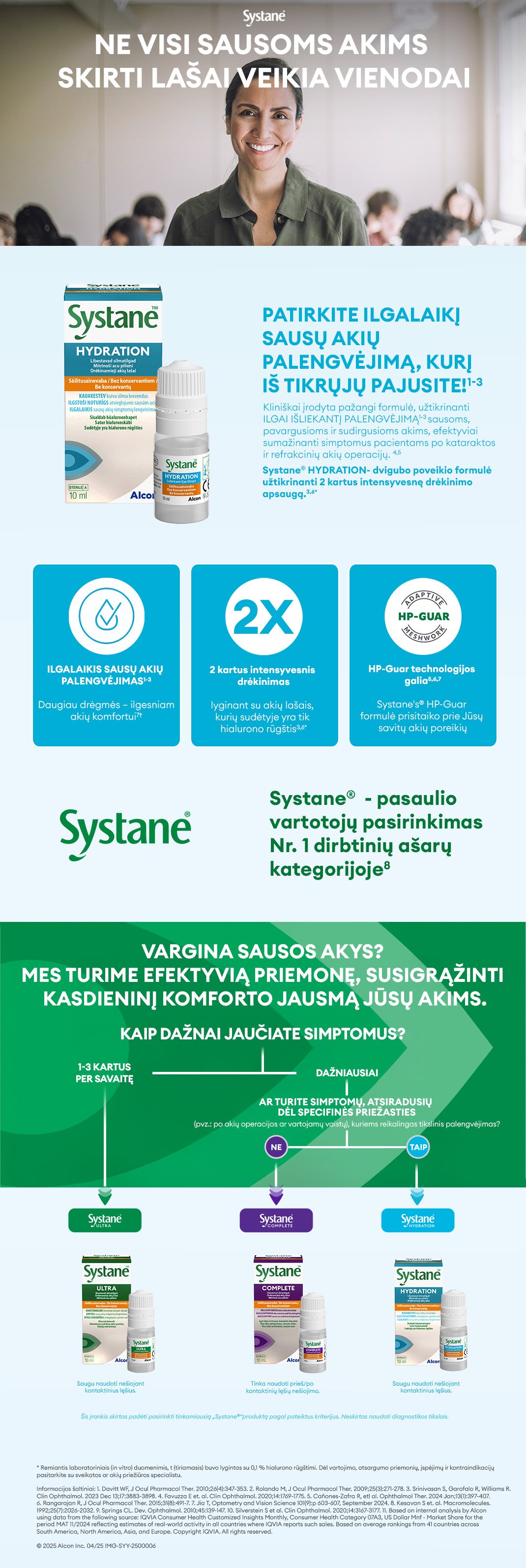Labai svarbu, kad vykdytumėte savo akių priežiūros specialisto nurodymus ir visas gaminio pakuotėje pateikiamas tinkamo gaminio naudojimo instrukcijas. Jei pasireiškia nuolatinis akies diskomfortas, smarkus ašarojimas, regos pokyčių ar akies paraudimas, nutraukite SYSTANETM HYDRATION tepamųjų akių lašų naudojimą ir kreipkitės į savo akių priežiūros specialistą, kadangi problema gali pasunkėti.