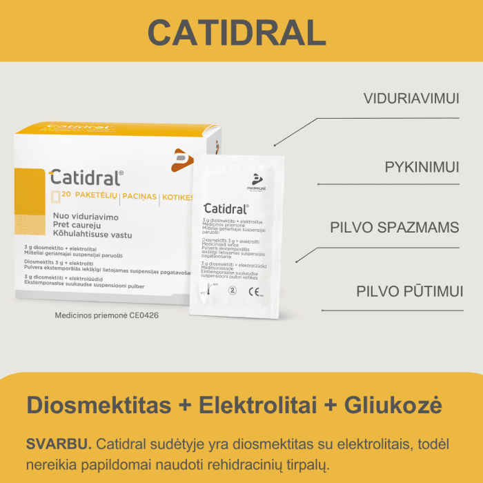CATIDRAL yra vienkartinio naudojimo medicinos priemonė paketėliuose, kuriuose yra miltelių geriamajam tirpalui paruošti. Kiekvieną paketėlį sunaudokite.. Skaityti daugiau