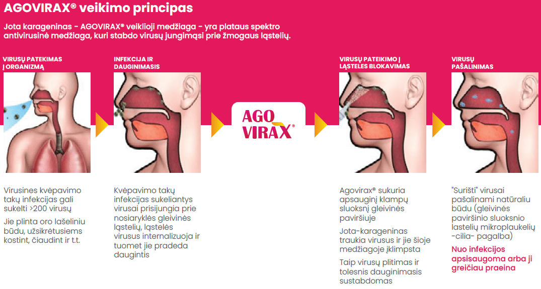 AGOVIRAX® (jota-karageninas) yra efektyvus prieš >200 virusines kvėpavimo takų infekcijas sukeliančių virusų (rinovirusą, korona virusą, adenovirusą, gripo virusą ir t.t.)
