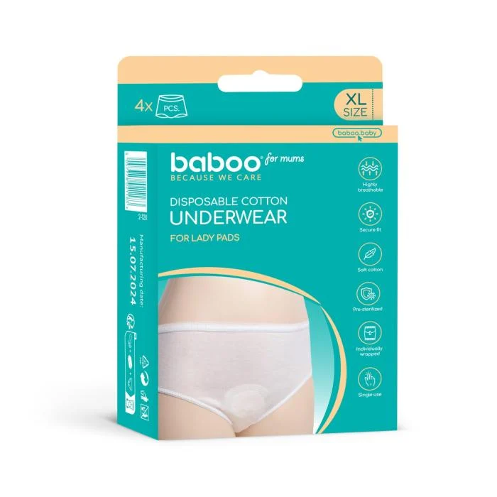 Patirkite komfortą ir patogumą su BABOO® Vienkartinėmis Medvilninėmis Kelnaitėmis – idealiu pasirinkimu po gimdymo ir įvairiam naudojimui.