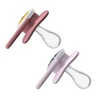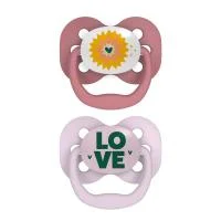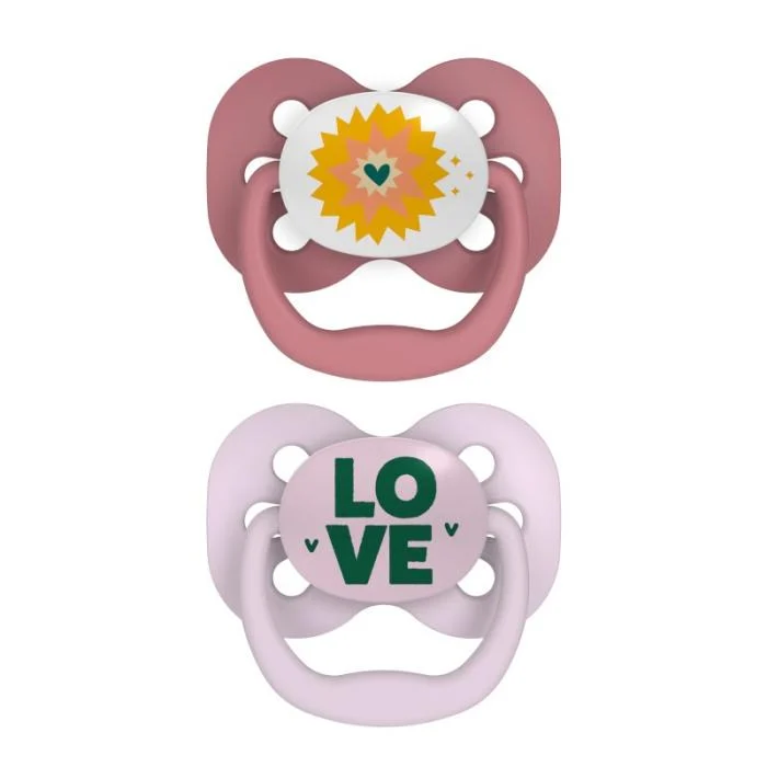 Dvipusiai čiulptukai su dangteliais. Simetriški čiulptukai: nesvarbu, kuria puse įdėsite vaikui į burnytę. Minkšti, silikoniniai, labai ploni, kad negadintų sąkandžio. Plastikinis diskelis su skylutėmis leidžia cirkuliuoti orui ir nedirgina odelės aplink burnytę. Su apsauginiais dangteliais. Skirti vaikams nuo gimimo iki 6 mėnesių.