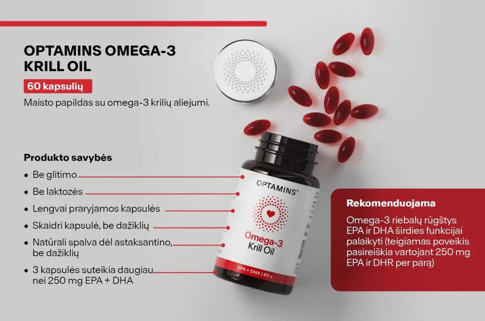 Vartodami 3 OPTAMINS Omega-3 krilio aliejaus kapsules per dieną, gausite daugiau nei 250 mg EPA ir DHA, kurios padeda palaikyti normalią širdies funkciją.