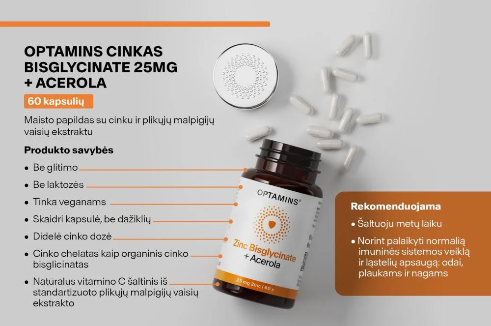 Kita cinko įsisavinimui reikšminga medžiaga yra vitaminas C. Acerola, dar vadinama Barbadoso vyšnia, yra natūralus vitamino C šaltinis. Šis rūgštus vaisius iš Centrinės ir Pietų Amerikos garsėja itin dideliu šio vitamino kiekiu. OPTAMINS Zinc Bisglycinate + Acerola sudėtyje naudojamas acerolos vaisių ekstraktas (lot. Malpighia glabra L.) turi net 25 % vitamino C. Be to, jis ne tik prisideda prie imuninės sistemos stiprinimo, bet ir padeda apsaugoti ląsteles nuo oksidacinio streso.