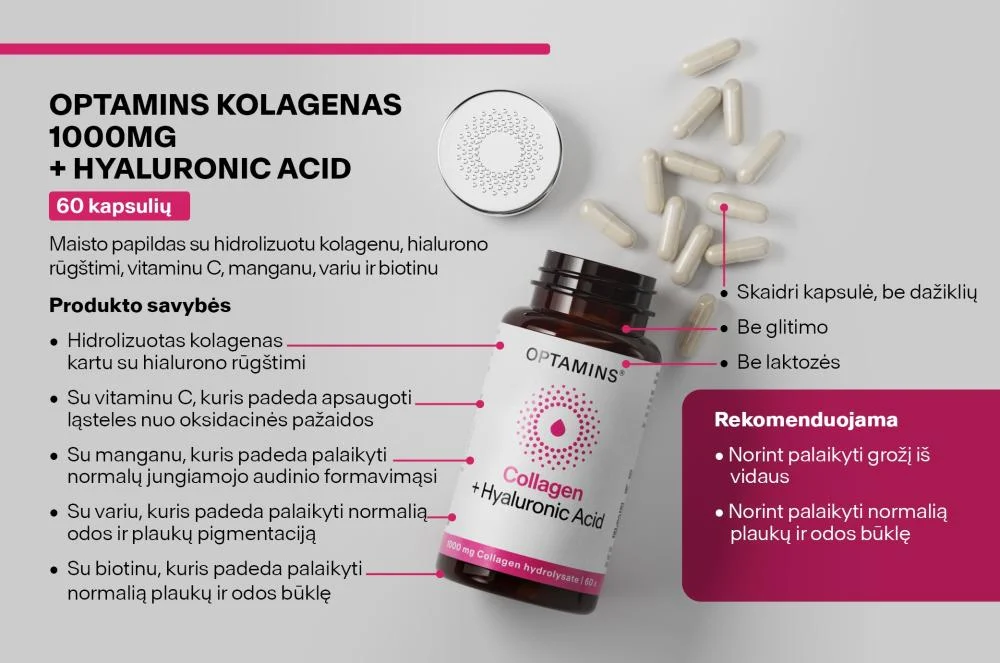 OPTAMINS Collagen + Hyaluronic Acid formulė sukurta palaikyti odos, jungiamojo audinio ir ląstelių sveikatą. Kiekvienoje porcijoje yra 1000 mg hidrolizuoto kolageno ir 100 mg hialurono rūgšties, praturtintų odai ir audiniams svarbiausiais vitaminais bei mineralais. Šis papildas išsiskiria tuo, kad jame dominuoja I tipo kolagenas, o nedidelis III tipo kolageno kiekis papildo ir sustiprina bendrą poveikį.