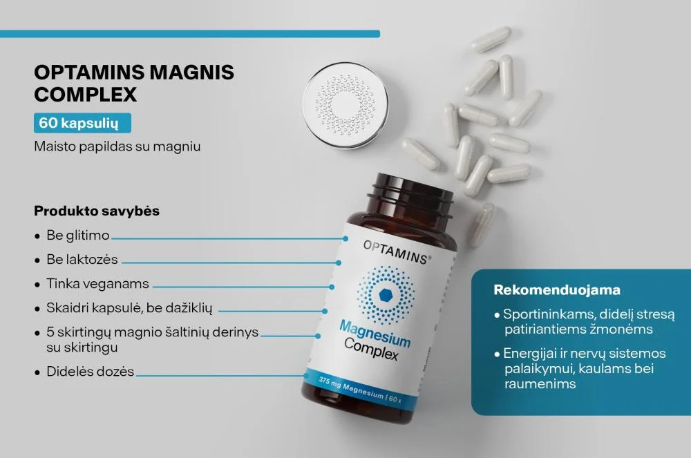 Skaityti daugiauDidžioji dalis, apie 60 % viso organizme esančio magnio, saugoma kauluose. 30 % šios medžiagos yra kepenyse ir raumenyse, o likusi dalis paskirstyta po kitus audinius. Magnis padeda mažinti pavargimo jausmą ir nuovargį, palaiko normalią nervų sistemos veiklą, raumenų funkciją, energijos apykaitą.