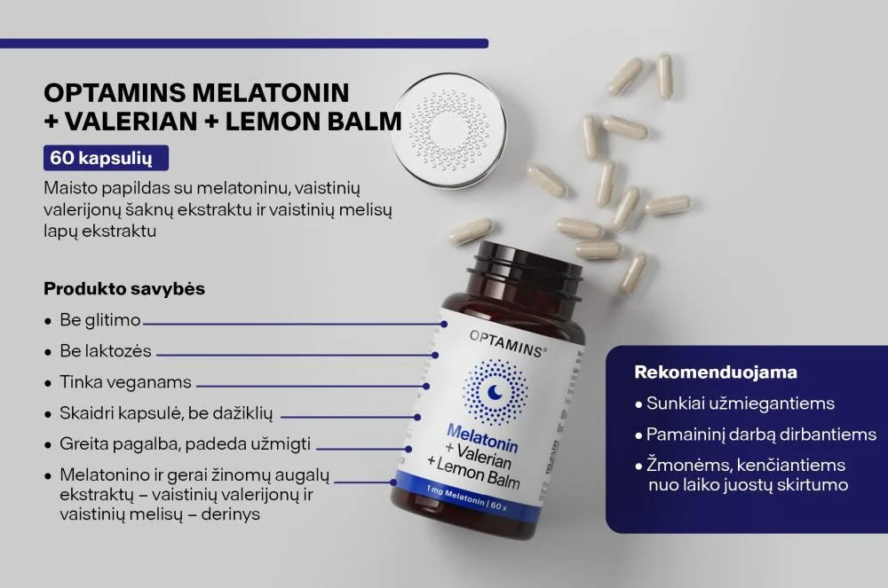 OPTAMINS Melatonin + Valerian + Lemon Balm sudėtyje yra 1 mg melatonino, kuris padeda sutrumpinti užmigimo laiką. Formulė praturtinta vaistinės melisos (lot. Melissa officinalis L.) ekstraktu, tradiciškai naudojamu lengvam psichologiniam stresui mažinti ir užmigimui palengvinti. Panašų teigiamą poveikį turi ir valerijono šaknis, kuri taip pat papildo šį derinį.
