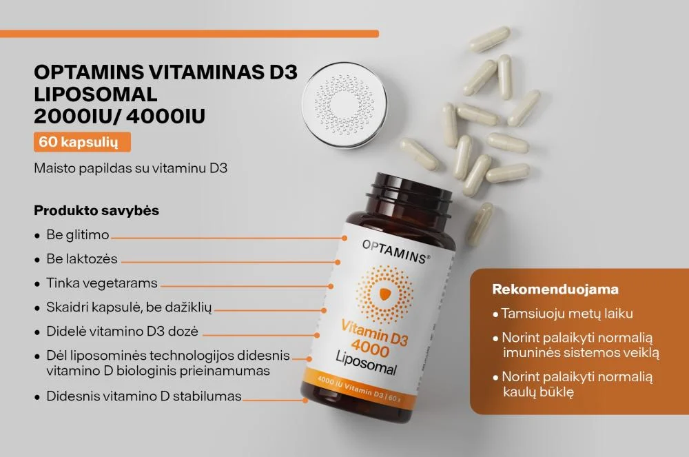 Vitaminas D išsiskiria iš kitų vitaminų – kūnas jį pasigamina natūraliai, veikiamas saulės šviesos. Vis dėlto, Lietuvoje saulėtų dienų ne tiek ir daug, todėl OPTAMINS Vitaminas D3 užtikrins, kad jūsų organizmas turėtų viską, ko jam reikia.