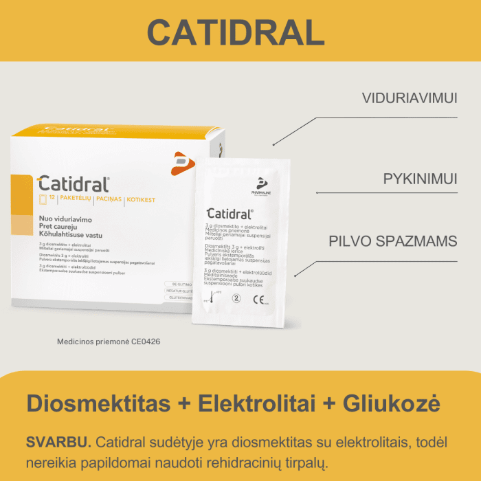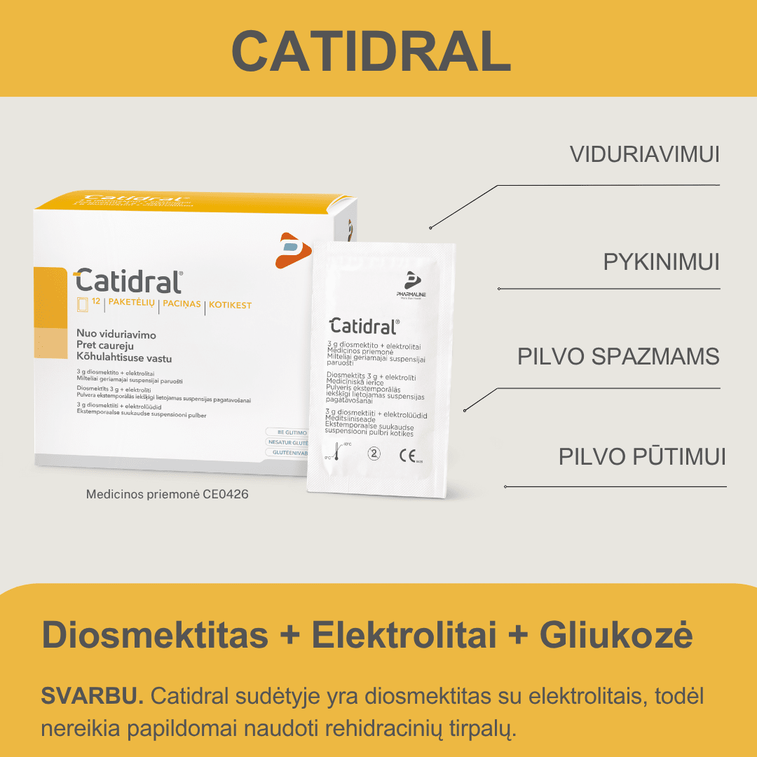 Didelė diosmektito absorbcinė geba gali sutrikdyti kai kurių per burną vartojamų vaistinių preparatų absorbciją virškinimo trakte. Dėl to tarp CATIDRAL ir per burną vartojamų vaistinių preparatų išgėrimo turi praeiti pakankamas laiko tarpas. CATIDRAL negalima naudoti žmonėms, kuriems pasireiškia vidurių užkietėjimas. Cukriniu diabetu sergantiems ar specifinės dietos besilaikantiems žmonėms reikia atkreipti dėmesį, kad CATIDRAL sudėtyje yra cukraus.