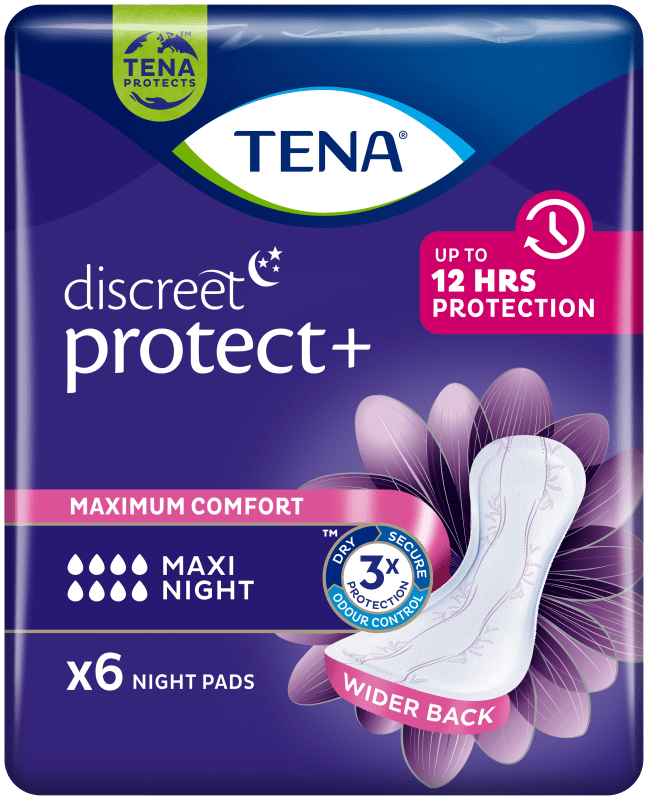 „TENA Discreet Maxi Night“ šlapimo nelaikymo paketai, išsiskiriantys nepriekaištinga apsauga moterims, yra ilgesni ir su platesne galine dalimi, kad uždengtų didesnį plotą bei suteiktų optimalią apsaugą gulint. Tinka vidutiniam ir sunkios formos šlapimo pūslės susilpnėjimui ypač nakčiai. Maksimalus sugeriamumas ten, kur jo reikia labiausiai, užtikrina, kad drėgmė būtų greitai sugeriama nuo odos ir išliktumėte sausa, o pažangūs miniatiūriniai gaivos perlai slopina nepageidaujamą kvapą. Minkšti, tamprūs paketų šonai prisitaiko prie kūno formos. Jie labai patogūs ir apsaugo nuo pratekėjimo bei nemalonaus kvapo, kad ramiai ir gerai miegotumėte visą naktį.