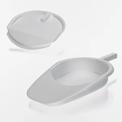 Plastmasinis, baltos spalvos, plokščias ir platus basonas su dangčiu - gulintiems ligoniams. Šoninės ir galinės rankenos užtikrina paprastą ir patogų naudojimą.