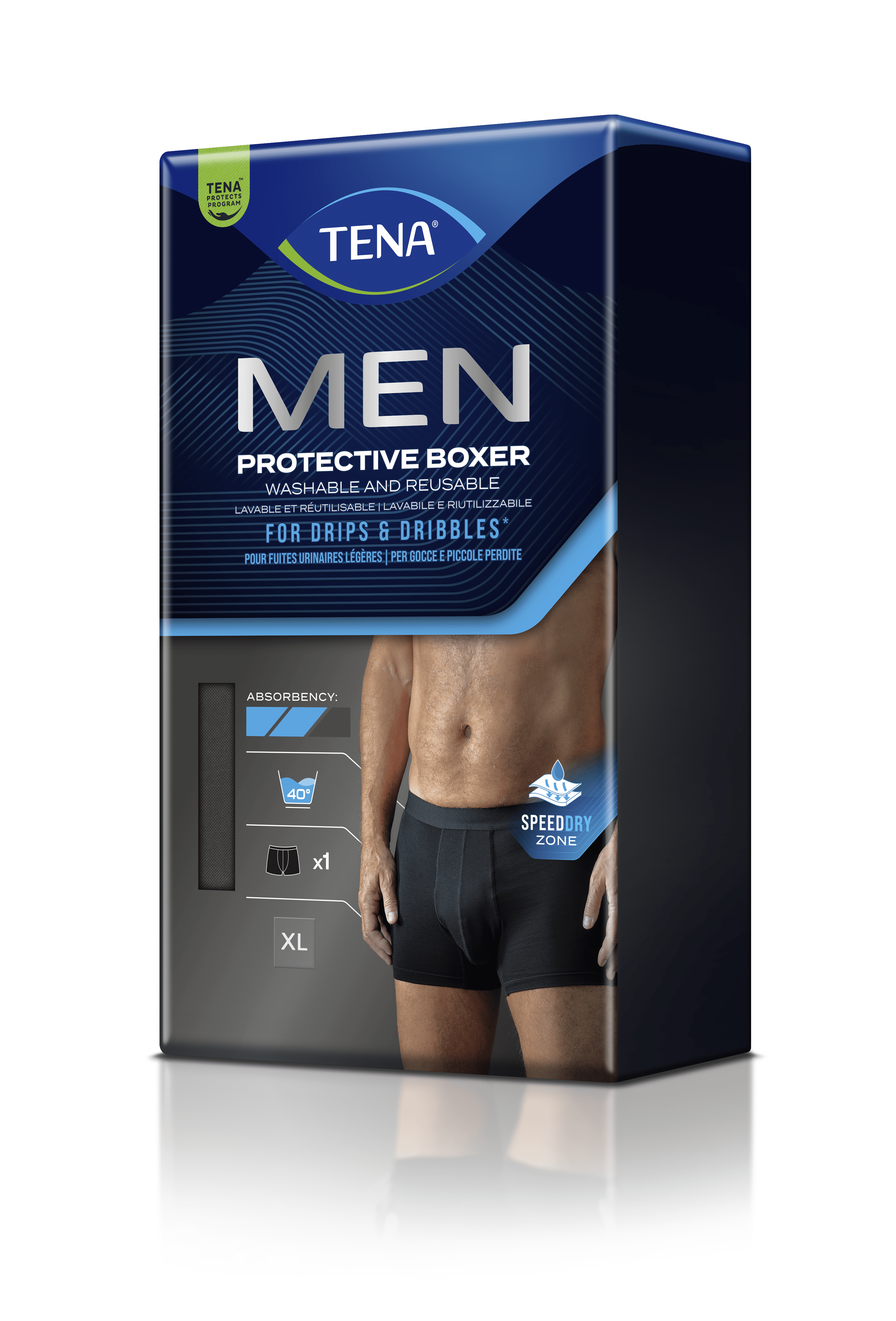 „TENA Men“ skalbiamos šortų tipo apsauginės kelnaitės, skirtos vyrams, patiriantiems lengvą šlapimo pūslės silpnumą. Šios daugkartinio naudojimo kelnaitės su integruota sugeriamąja sritimi apsaugo vyrus esant lengviems šlapimo išlašėjimams. Dėvimos kaip įprastos apatinės kelnaitės. Tiesiog skalbiamos kartu su kitais drabužiais 40 °C temperatūroje.