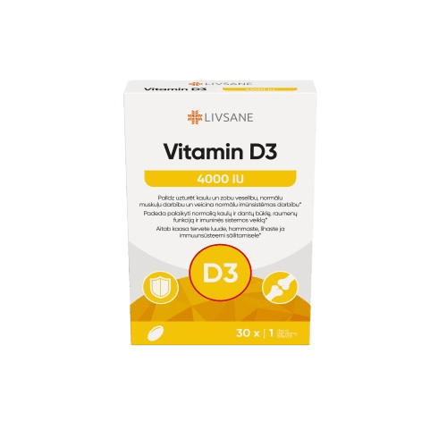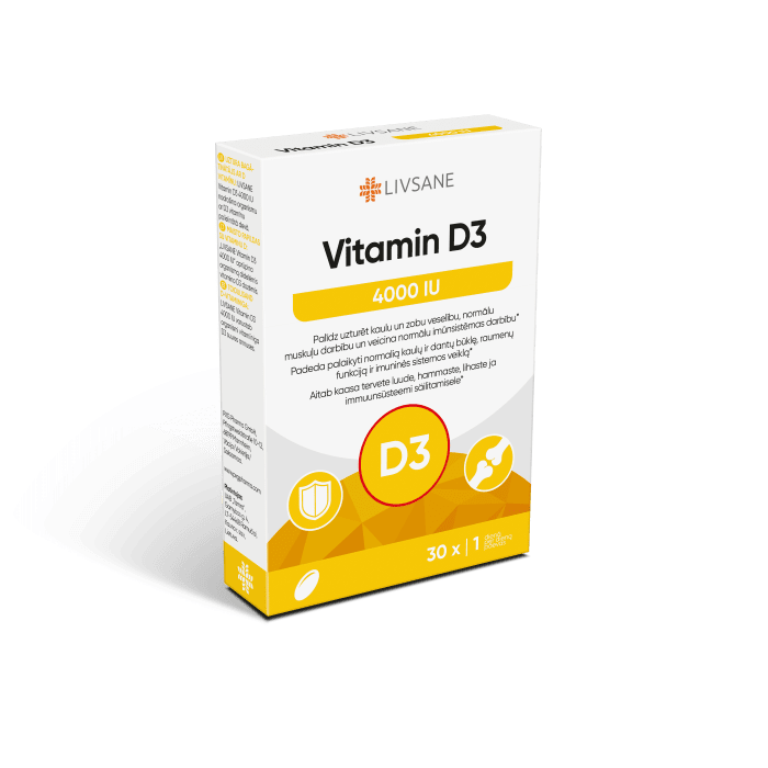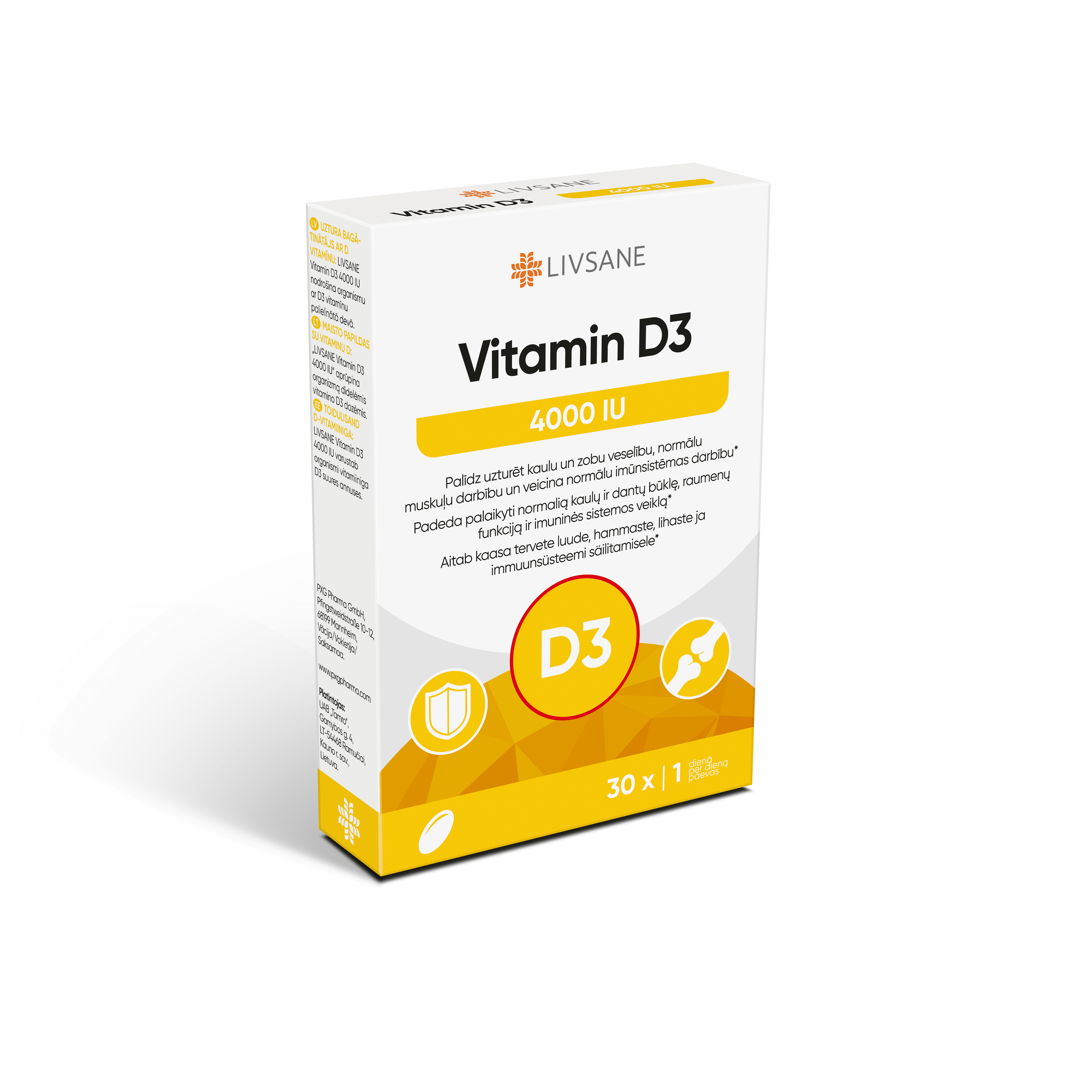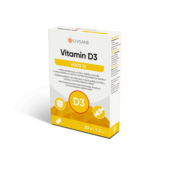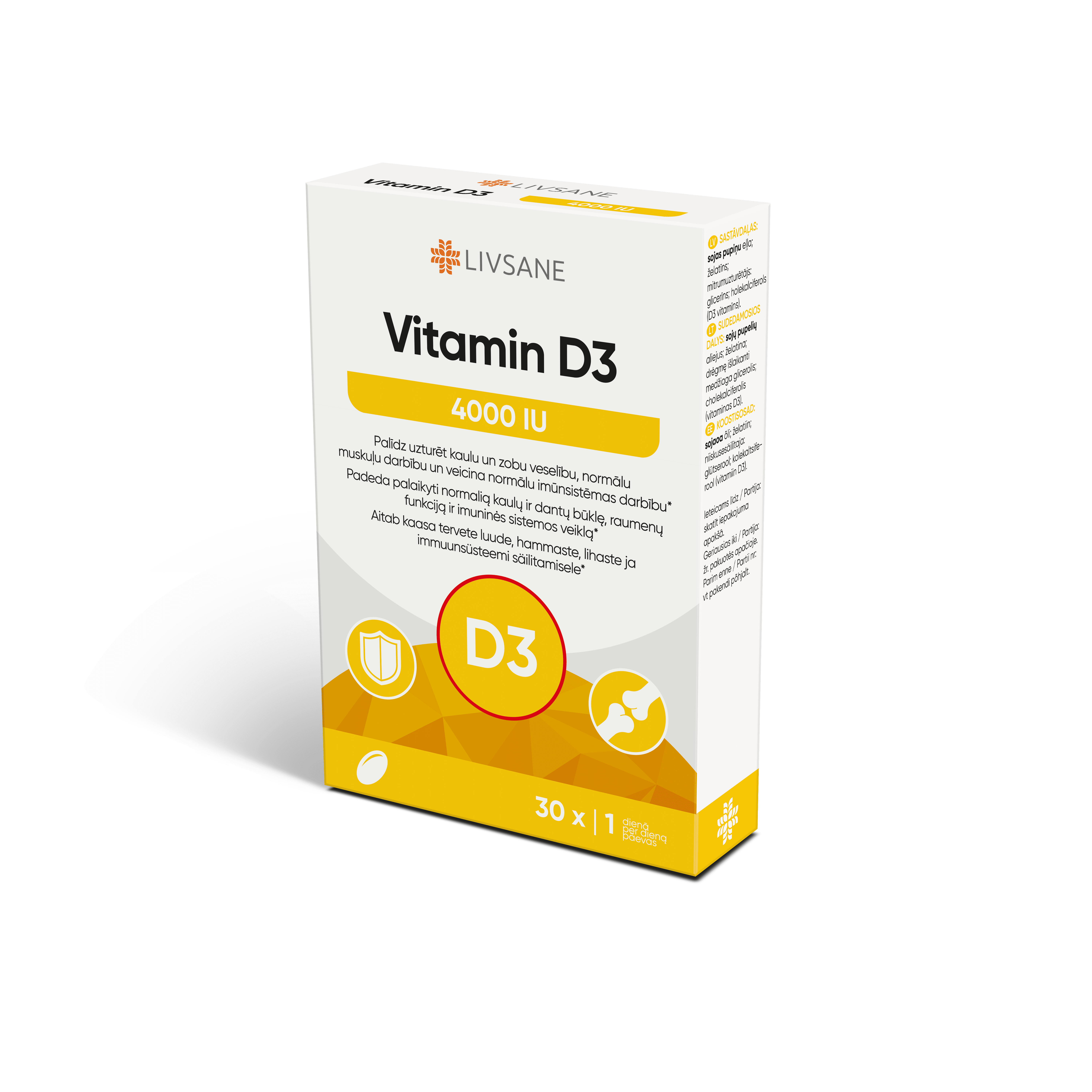 LIVSANE D3 4000 HIGH DOSE VITAMIN D aprūpina organizmą didelėmis dozėmis vitamino D3. *Vitaminas D padeda išsaugoti normalią kaulų, dantų būklę ir raumenų funkciją, taip pat palaiko imuninės sistemos funkcionavimą.